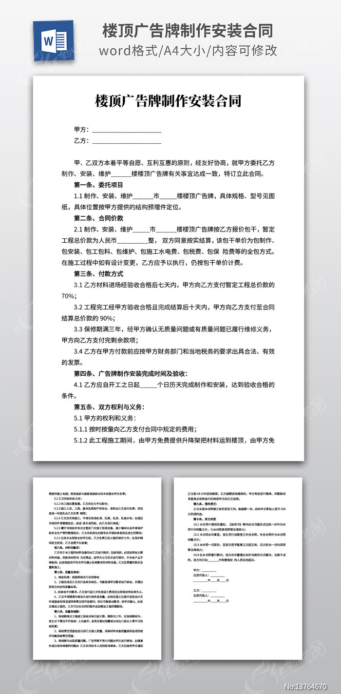 红动中国提供原创楼顶广告牌制作安装合同下载,该作品还可作为楼顶广告牌制作合同等范文模板使用,楼顶广告牌制作安装合同编号13764670,大小,欢迎会员进行下载。