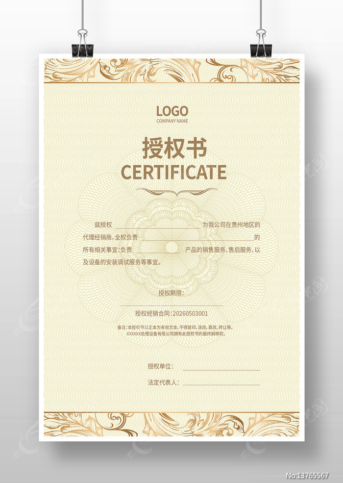 红动中国提供原创高档授权证书 设计下载,作品以企业任为主题而设计,可作为代理商授权书,经销商授权书,企业授权证书,产品授权书,代理授权书等主题图片使用,高档授权证书 设计,编号13765567,格式AI,尺寸300x450毫米,大小3.98 MB,欢迎会员进行下载。