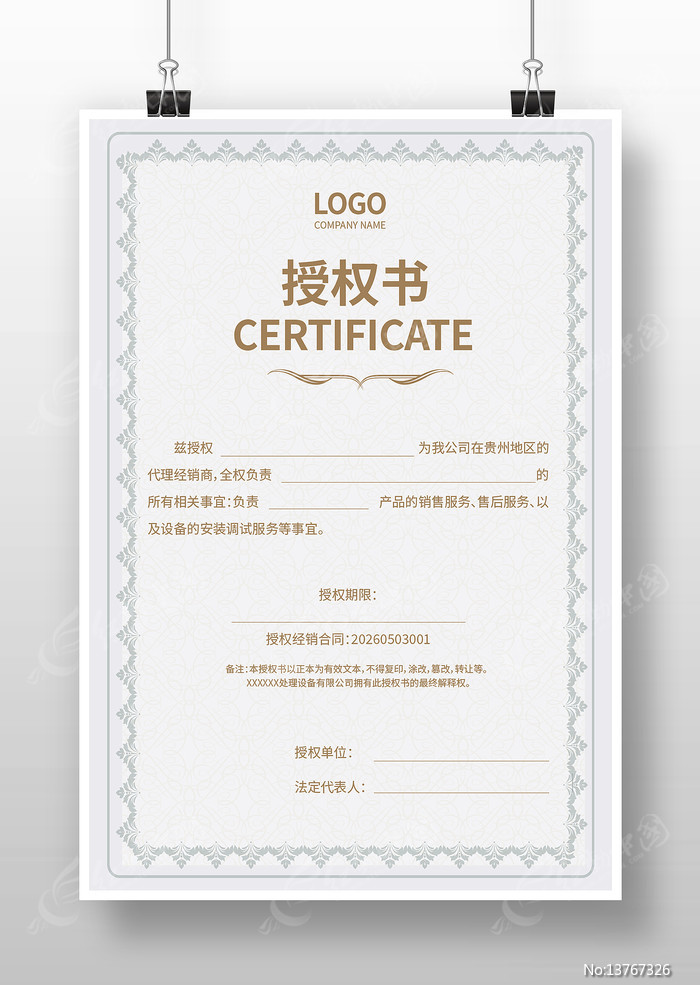红动中国提供原创授权证书模版下载,作品以代理商为主题而设计,可作为代理商授权书,经销商授权书,企业授权证书,产品授权书,代理授权书等主题图片使用,授权证书模版,编号13767326,格式AI,尺寸300x450毫米,大小1.52 MB,欢迎会员进行下载。