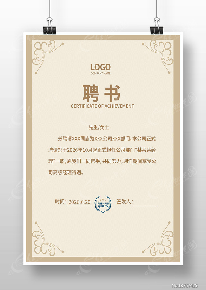 红动中国提供原创聘请书模版下载,作品以企业任为主题而设计,可作为优秀人才聘书,优秀员工聘书,公司聘请书,企业聘请书,企业聘用书等主题图片使用,聘请书模版,编号13767425,格式AI,尺寸300x450毫米,大小1.87 MB,欢迎会员进行下载。