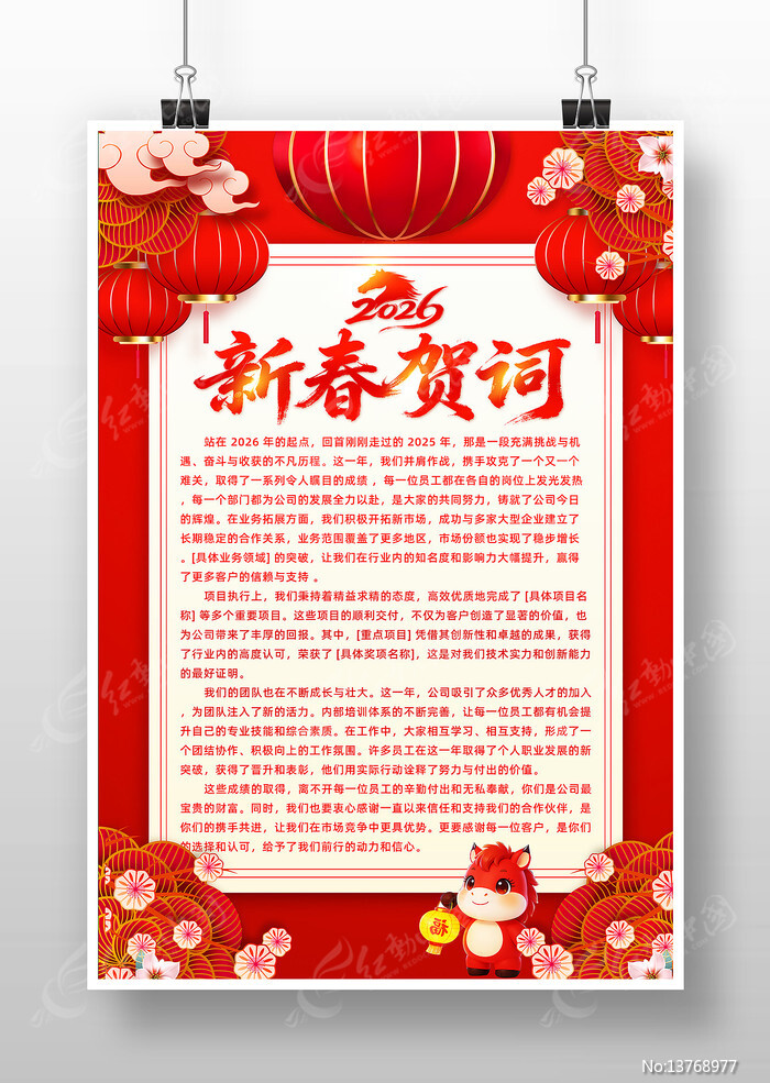 红动中国提供原创2026新春贺词新年贺词海报下载,作品以公司新春贺词为主题而设计,可作为公司新春贺词,马年新春贺词,企业新春贺词,新春贺词背景,新春贺词内容等主题图片使用,2026新春贺词新年贺词海报,编号13768977,格式PSD,尺寸300x450毫米,大小15.51 MB,欢迎会员进行下载。
