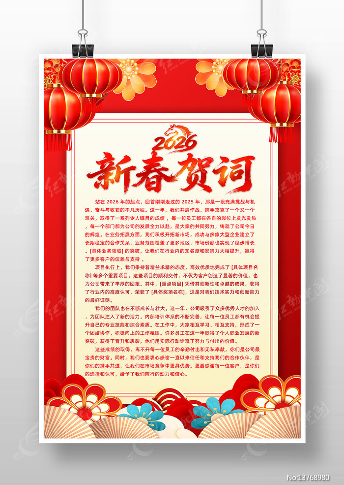 红动中国提供原创大气时尚2026马年企业新春贺词海报下载,作品以公司新春贺词为主题而设计,可作为公司新春贺词,马年新春贺词,企业新春贺词,新春贺词背景,新春贺词内容等主题图片使用,大气时尚2026马年企业新春贺词海报,编号13768980,格式PSD,尺寸300x450毫米,大小19.9 MB,欢迎会员进行下载。