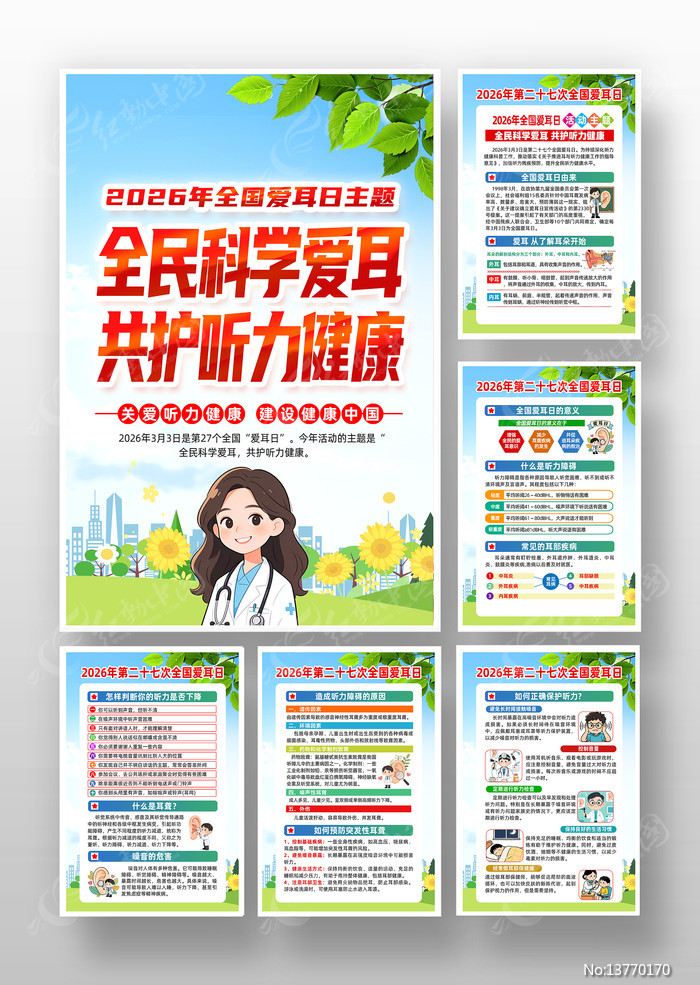 红动中国提供原创2026年第27个全国爱耳日挂图下载,作品以爱耳日为主题而设计,可作为爱耳日宣传栏,共护听力健康,健康教育板报,健康教育展板,全民科学爱耳等主题图片使用,2026年第27个全国爱耳日挂图,编号13770170,格式PSD,尺寸300x450毫米,大小44.34 MB,欢迎会员进行下载。