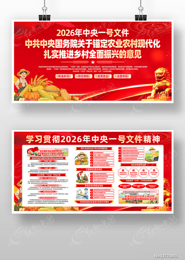 红动中国提供原创2026年中央一号文件推进乡村振兴宣传栏下载,作品以中央一号文件为主题而设计,可作为解读一号文件,深化农村改革,图解一号文件,乡村全面振兴,一号文件解读等主题图片使用,2026年中央一号文件推进乡村振兴宣传栏,编号13770843,格式PSD,尺寸300x600毫米,大小57.25 MB,欢迎会员进行下载。