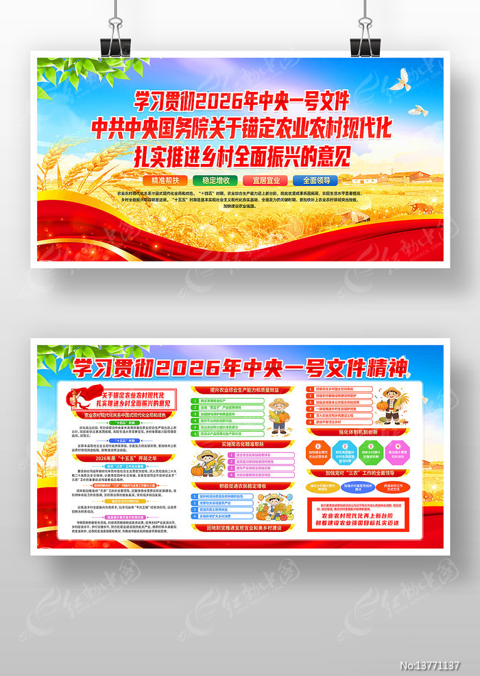 红动中国提供原创2026年中央一号文件党建宣传展板设计下载,作品以图解一号文件为主题而设计,可作为解读一号文件,深化农村改革,图解一号文件,乡村全面振兴,一号文件精神等主题图片使用,2026年中央一号文件党建宣传展板设计,编号13771137,格式PSD,尺寸600x300毫米,大小53.25 MB,欢迎会员进行下载。