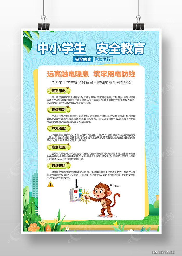 红动中国提供原创防触电中小学生安全安全教育日科普海报下载,作品以安全教育为主题而设计,可作为全国中小学生安全教育日,安全教育海报,校园安全教育,安全教育日,安全教育等主题图片使用,防触电中小学生安全安全教育日科普海报,编号13772312,格式PSD,尺寸450x300毫米,大小50.12 MB,欢迎会员进行下载。