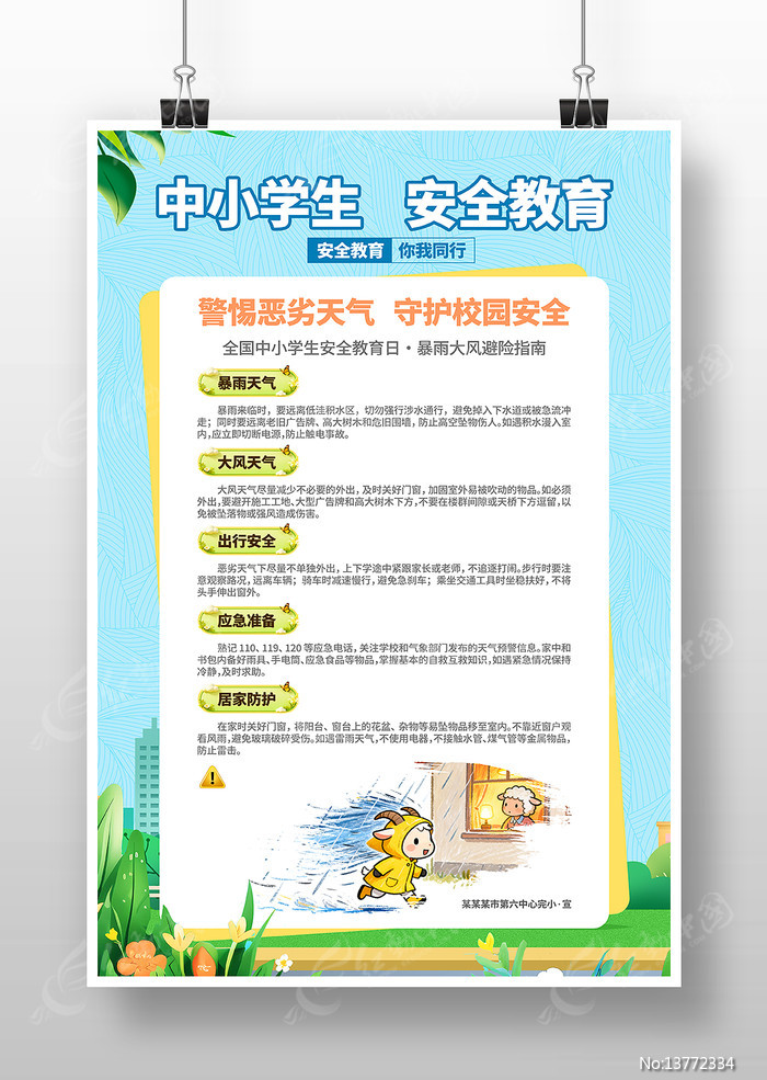 红动中国提供原创暴雨大风避险中小学生安全安全教育科普海报下载,作品以安全教育为主题而设计,可作为全国中小学生安全教育日,安全教育海报,校园安全教育,安全教育日,安全教育等主题图片使用,暴雨大风避险中小学生安全安全教育科普海报,编号13772334,格式PSD,尺寸300x450毫米,大小51.68 MB,欢迎会员进行下载。