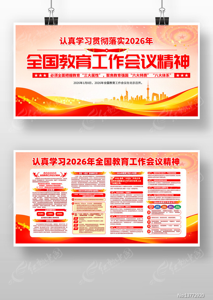 红动中国提供原创贯彻2026年全国教育工作会议精神展板下载,作品以教育工作会议为主题而设计,可作为全国教育学习贯彻,教育工作会议,教育会议精神,党建展板,教育工作等主题图片使用,贯彻2026年全国教育工作会议精神展板,编号13772920,格式PSD,尺寸2400x1200毫米,大小79.12 MB,欢迎会员进行下载。