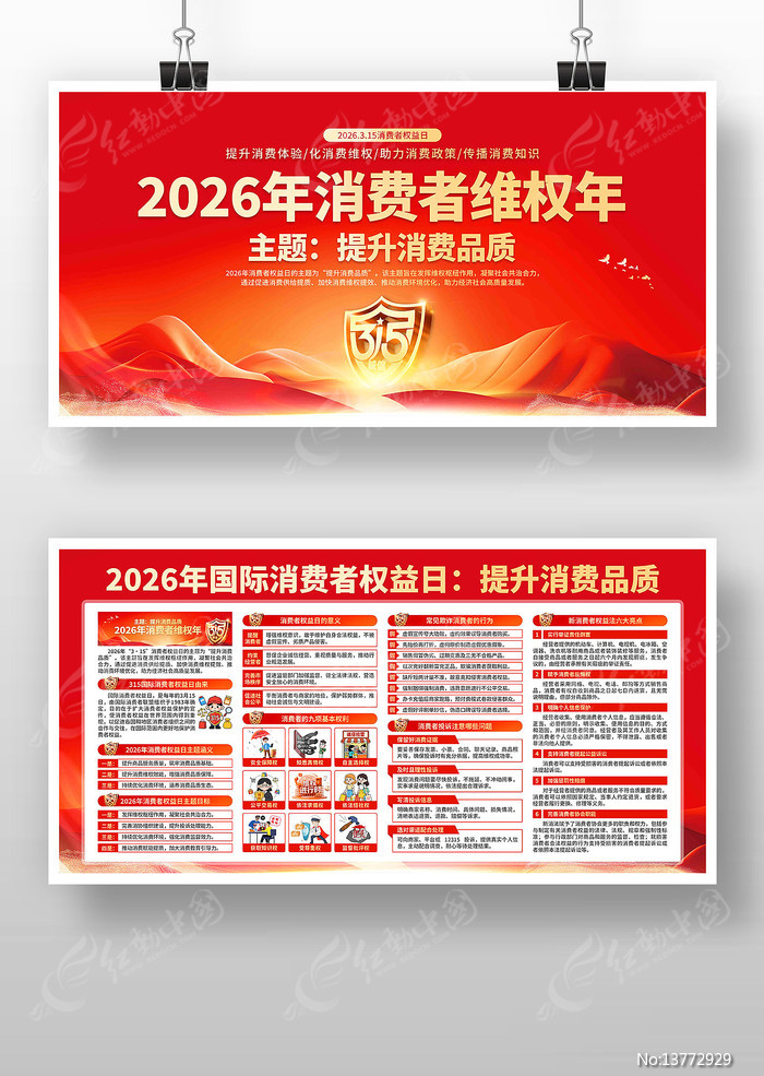 红动中国提供原创315消费者权益日展板下载,作品以2026年消费者权益日为主题而设计,可作为2026年消费者权益日,提升消费品质,消费者权益日,国际消费者,消费权益日等主题图片使用,315消费者权益日展板,编号13772929,格式PSD,尺寸6000x3000毫米,大小60.87 MB,欢迎会员进行下载。