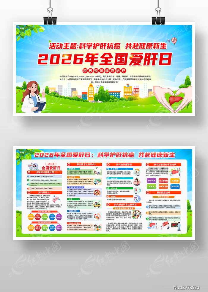 红动中国提供原创2026年全国爱肝日展板下载,作品以社区卫生宣传为主题而设计,可作为肝炎防治知识,社区卫生宣传,爱肝日展板,全国爱肝日,世界肝炎日等主题图片使用,2026年全国爱肝日展板,编号13773520,格式PSD,尺寸6803x3402毫米,大小91.94 MB,欢迎会员进行下载。