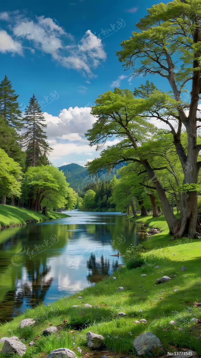 河畔绿树蓝天白云自然风光