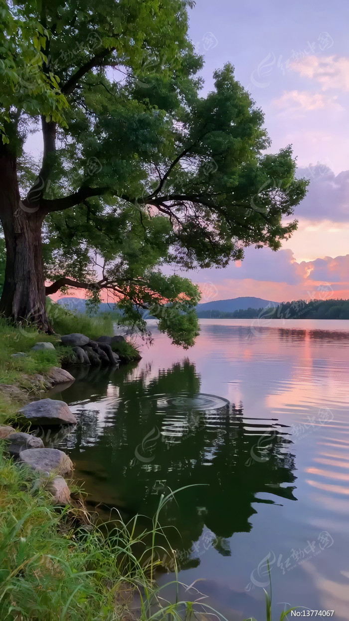 湖畔大树夕阳美景