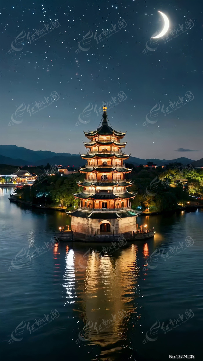 月夜下湖中的中式塔楼景观