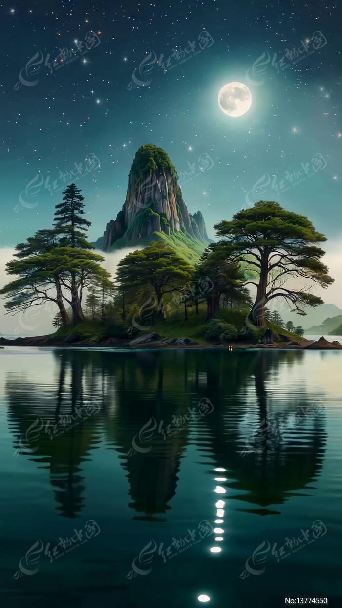 月夜山林湖面风景
