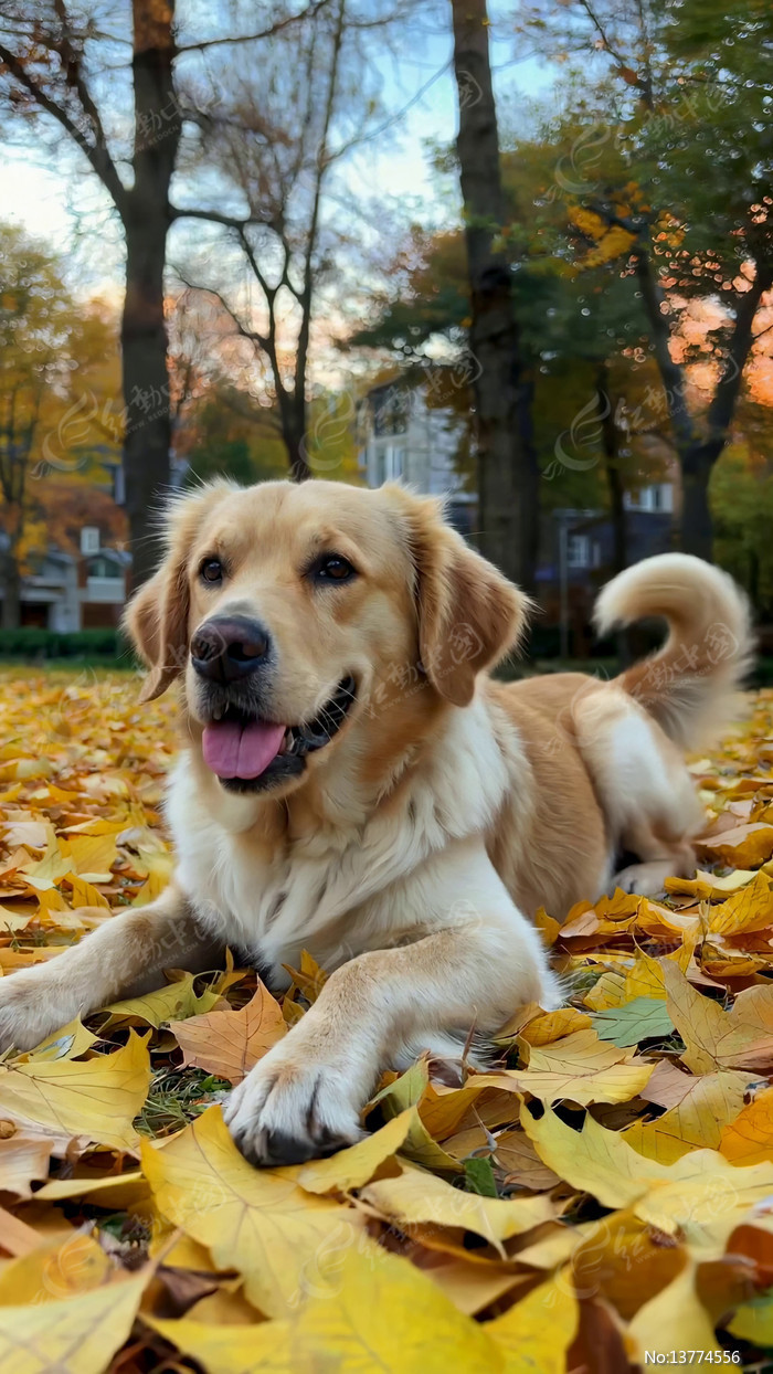 秋日公园中休憩的金毛犬