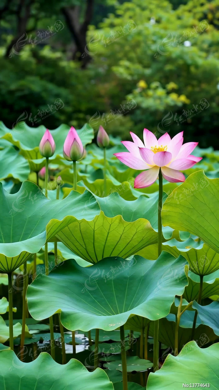 盛开荷花与荷叶自然景观
