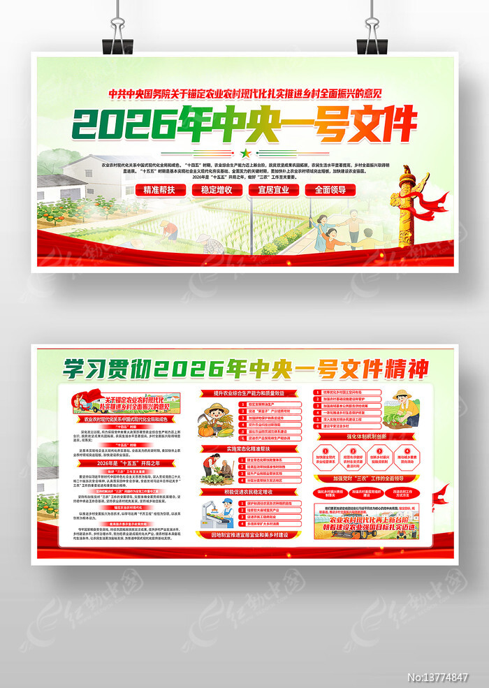 红动中国提供原创2026年中央一号文件文件乡村振兴展板下载,作品以一号文件精神为主题而设计,可作为解读一号文件,深化农村改革,图解一号文件,乡村全面振兴,一号文件解读等主题图片使用,2026年中央一号文件文件乡村振兴展板,编号13774847,格式PSD,尺寸300x600毫米,大小71.09 MB,欢迎会员进行下载。