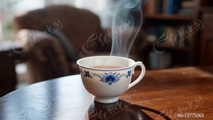 桌上青花瓷杯热气腾腾