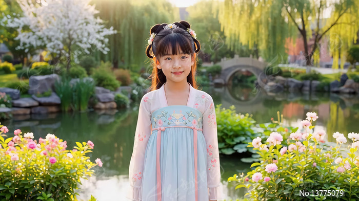 穿汉服小女孩园林中微笑
