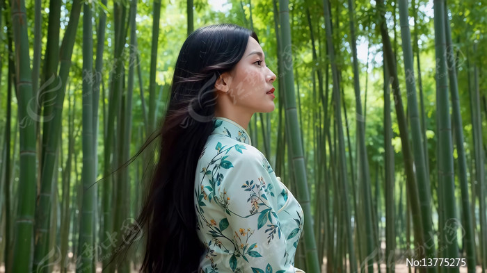 竹林中身着花衣女子侧身而立