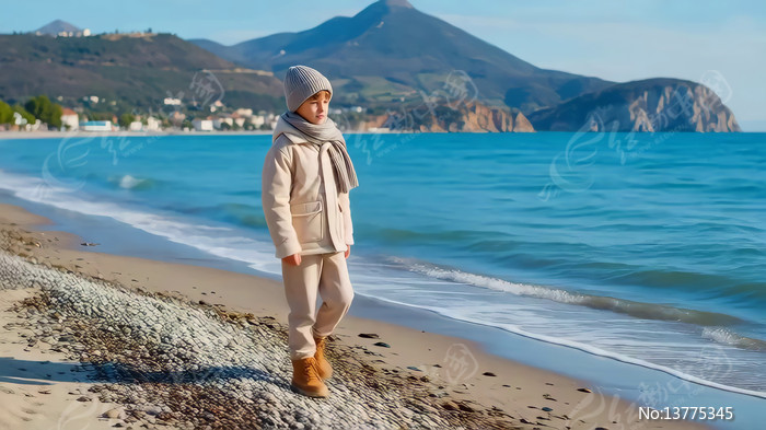 孩童海边沙滩漫步