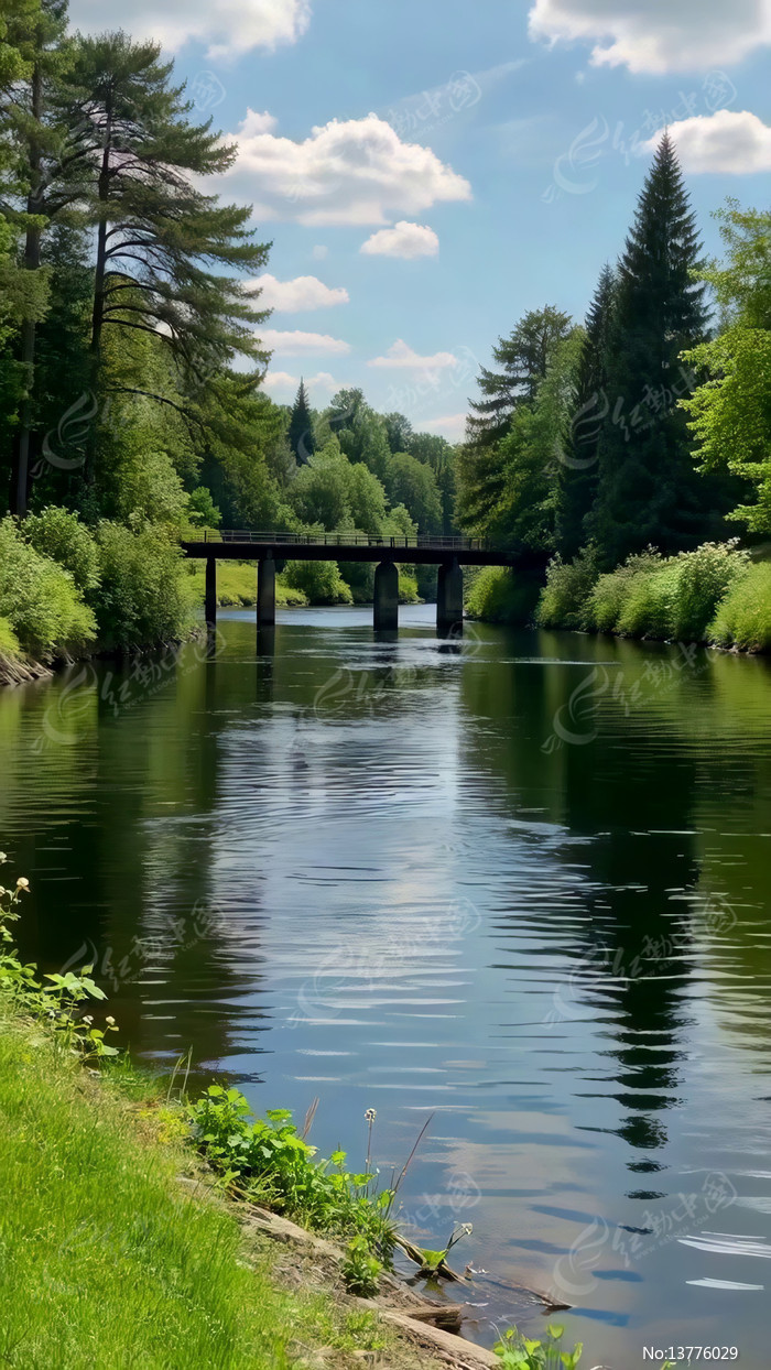 河流森林间的桥梁自然风光