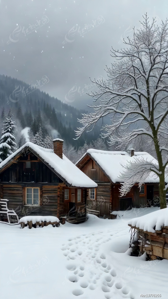 雪中木屋与山林自然景观