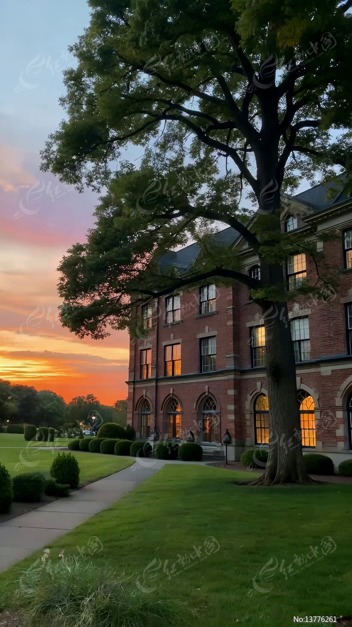 夕阳下红砖建筑与大树景观