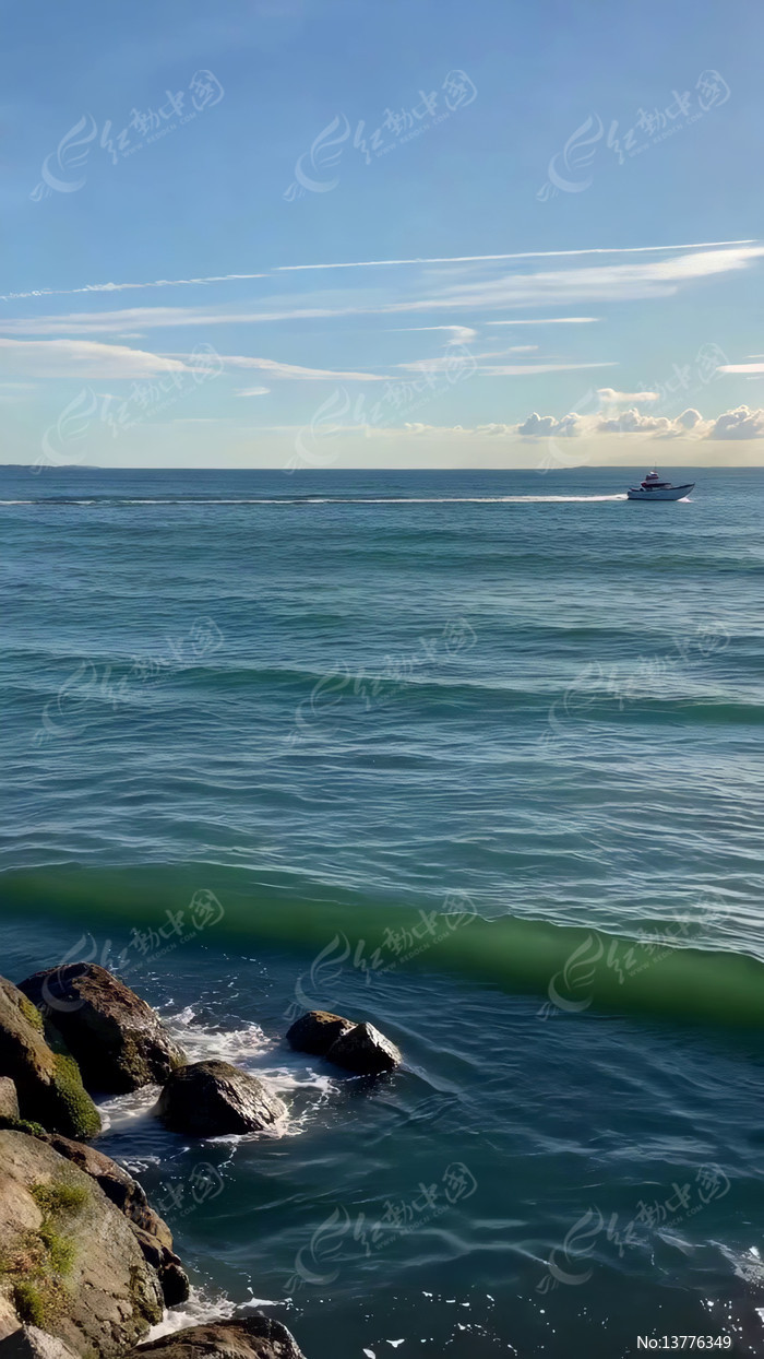 海边礁石海浪与海上行驶船只