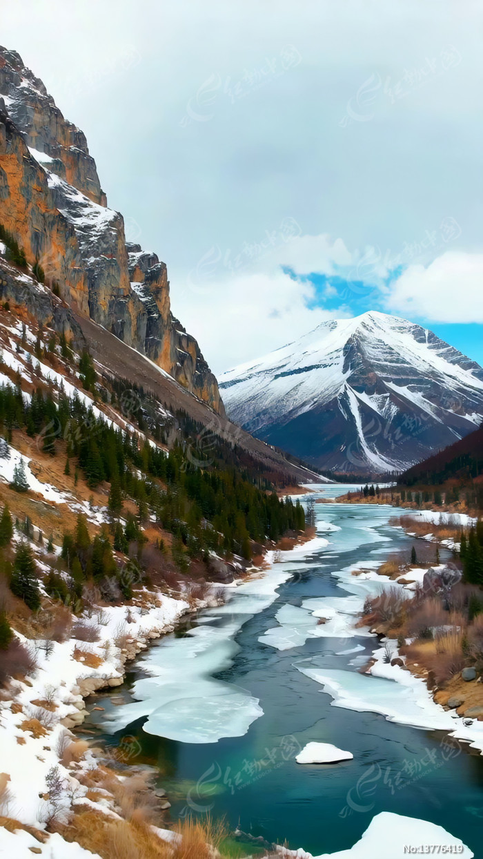 雪山下河流与山林风景