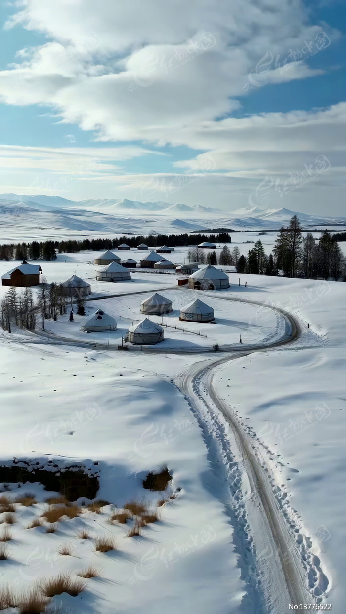 雪地中蒙古包群全景