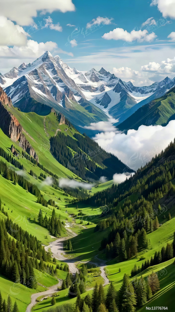 雪山下的绿色山谷风景