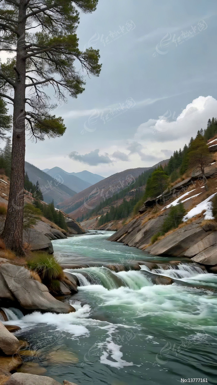 山间河流与松林风景素材