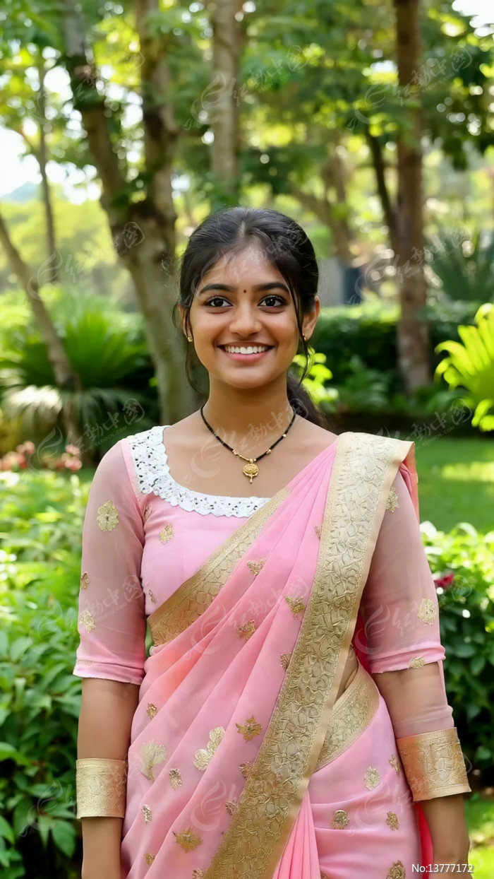 身着纱丽微笑的年轻女性