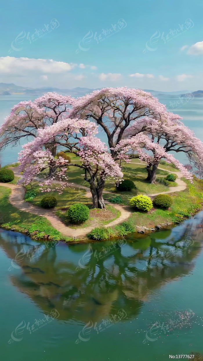 湖心岛盛开的粉色樱花树