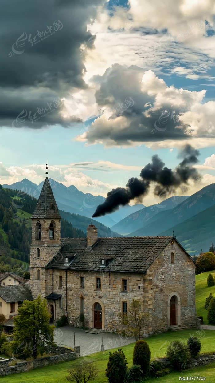 山间石砌教堂自然风光