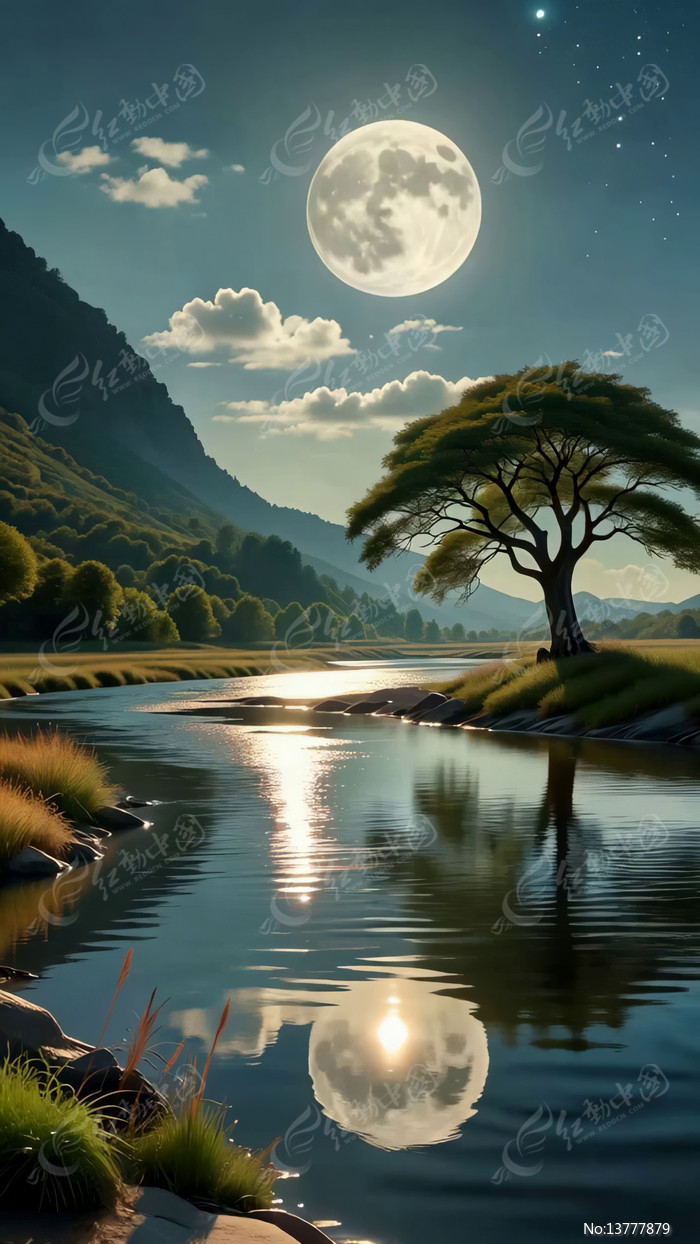 月夜下的山水与孤树风景
