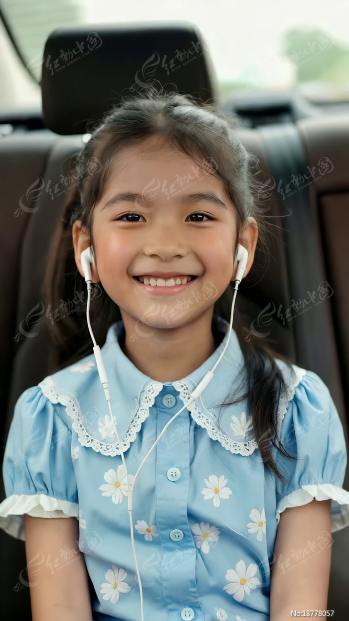 车内戴耳机微笑的小女孩