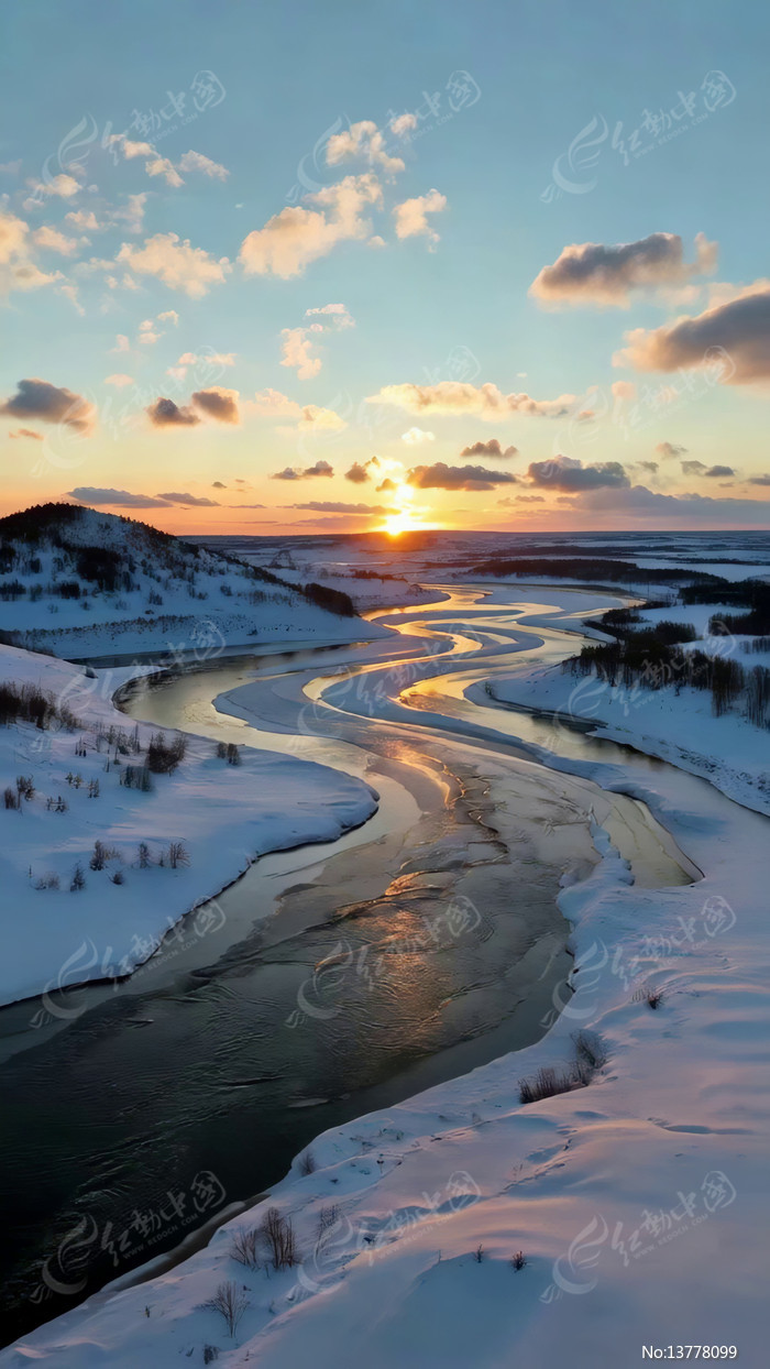 冬季雪域河流日落景观
