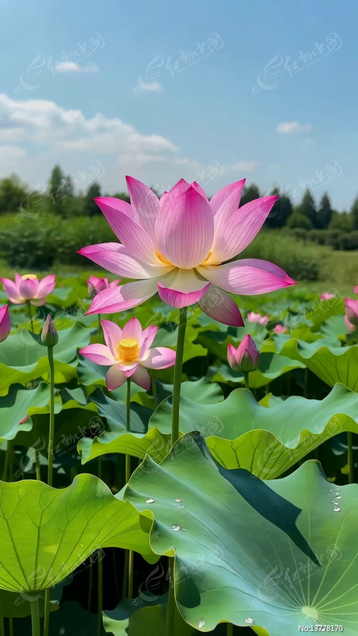盛开的粉色荷花与荷叶景观