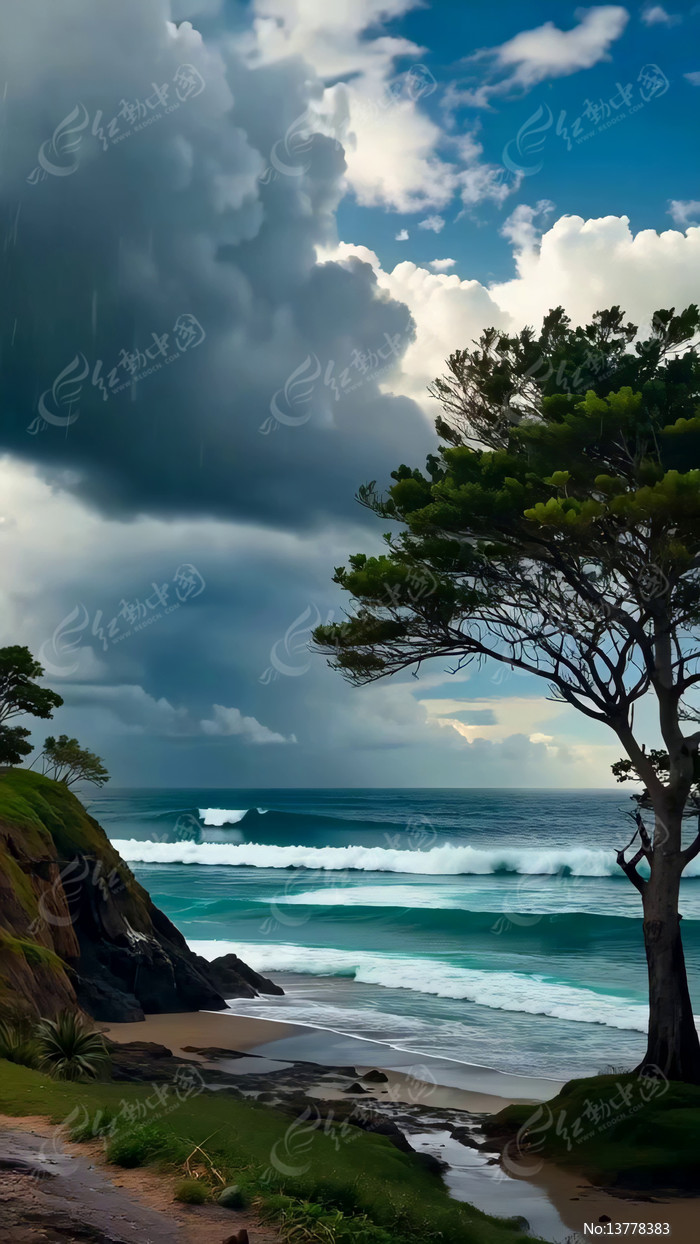 海边乌云下的树木与海浪景观