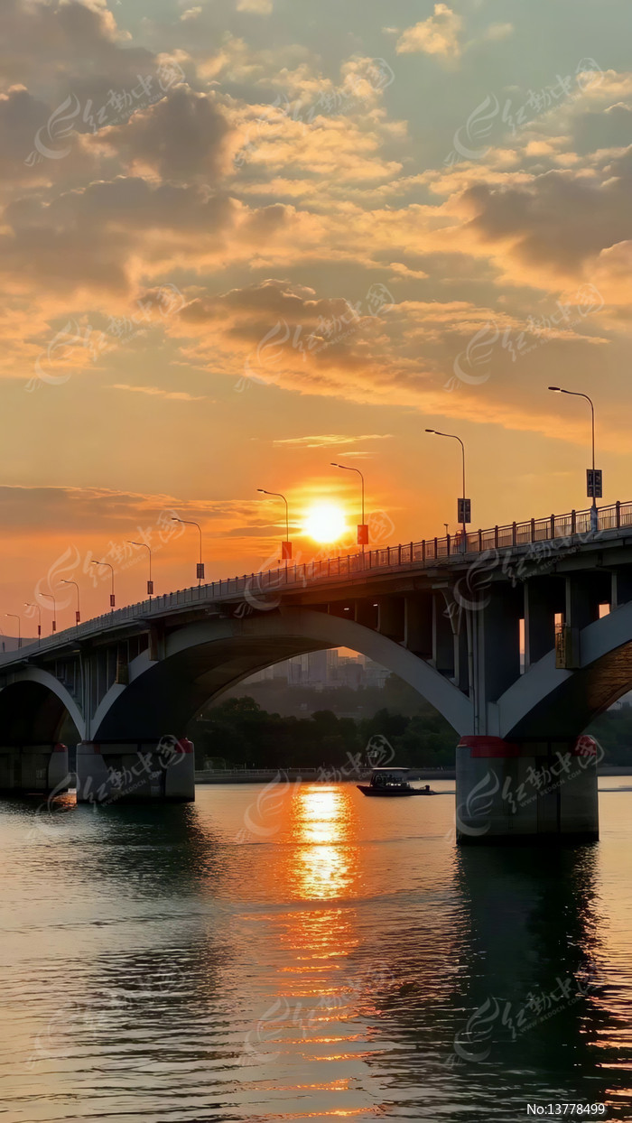 夕阳下桥梁河流风景
