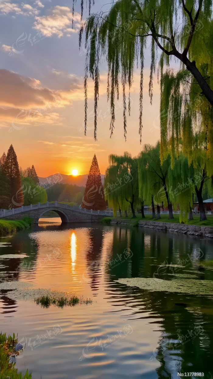 湖畔垂柳夕阳风景
