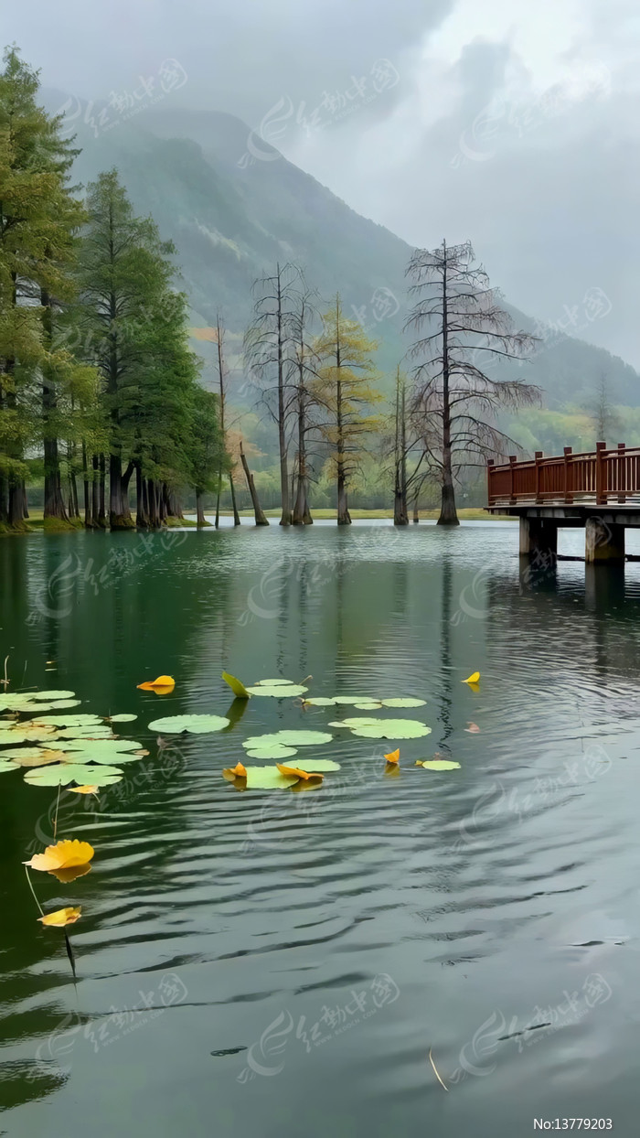 山水间湖泊与木桥自然风光