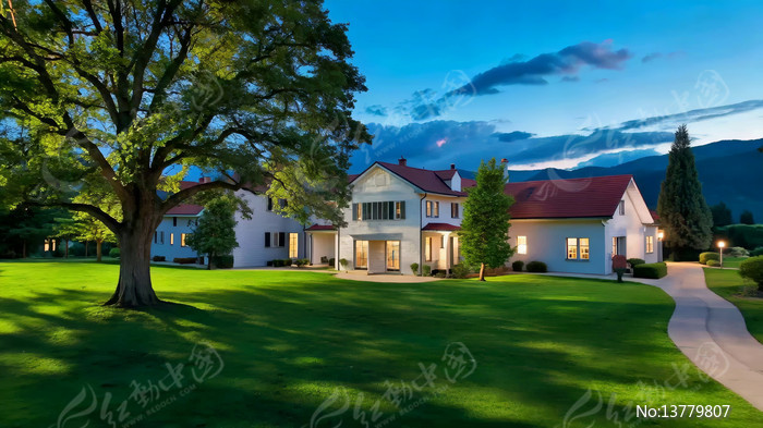 黄昏时独栋别墅及周边景观