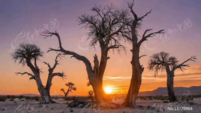 沙漠枯树立黄昏自然景观
