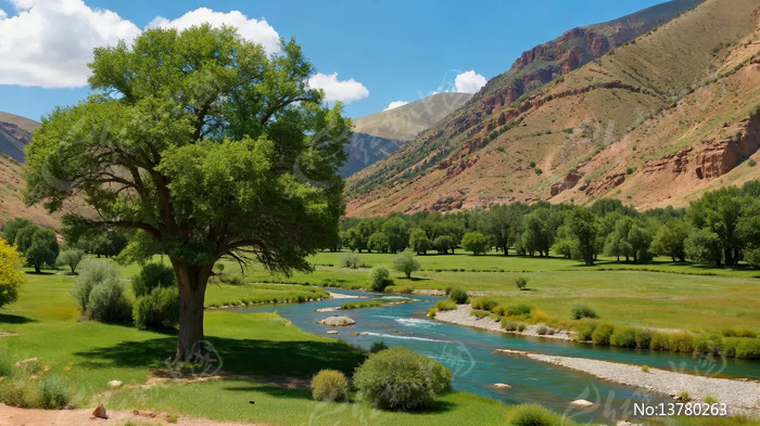 山间河流旁绿树草原风景