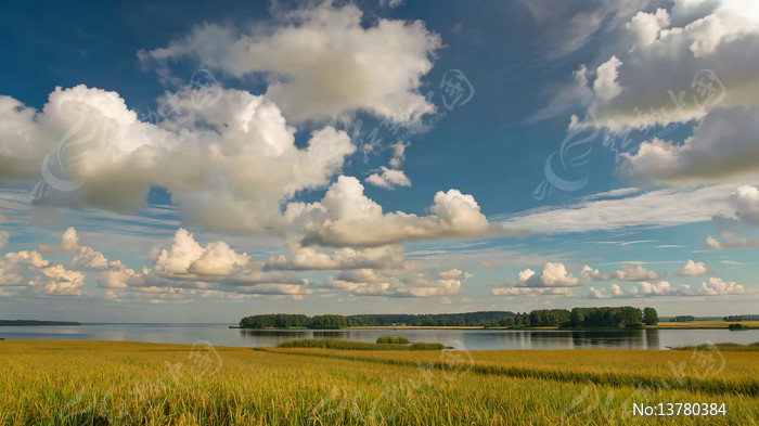 田野湖畔蓝天白云自然风光