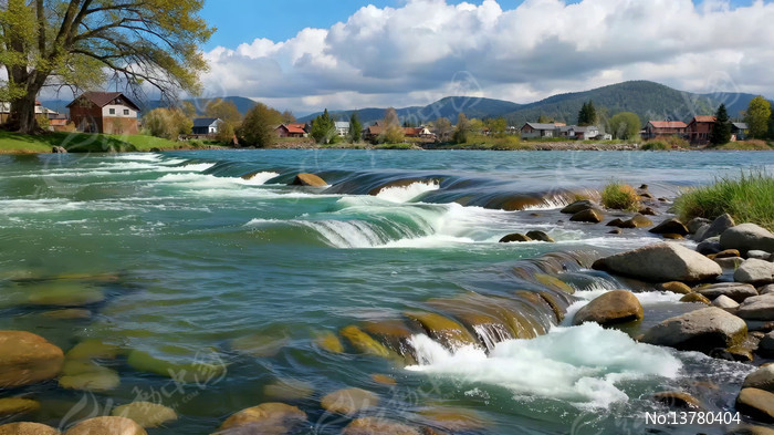 河边村庄自然风光