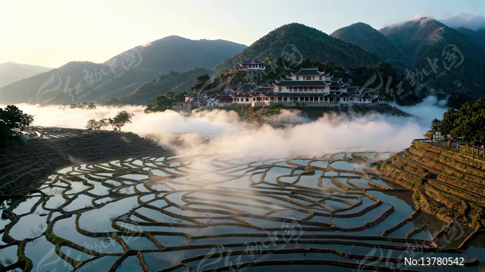 山间梯田与云雾中的建筑景观